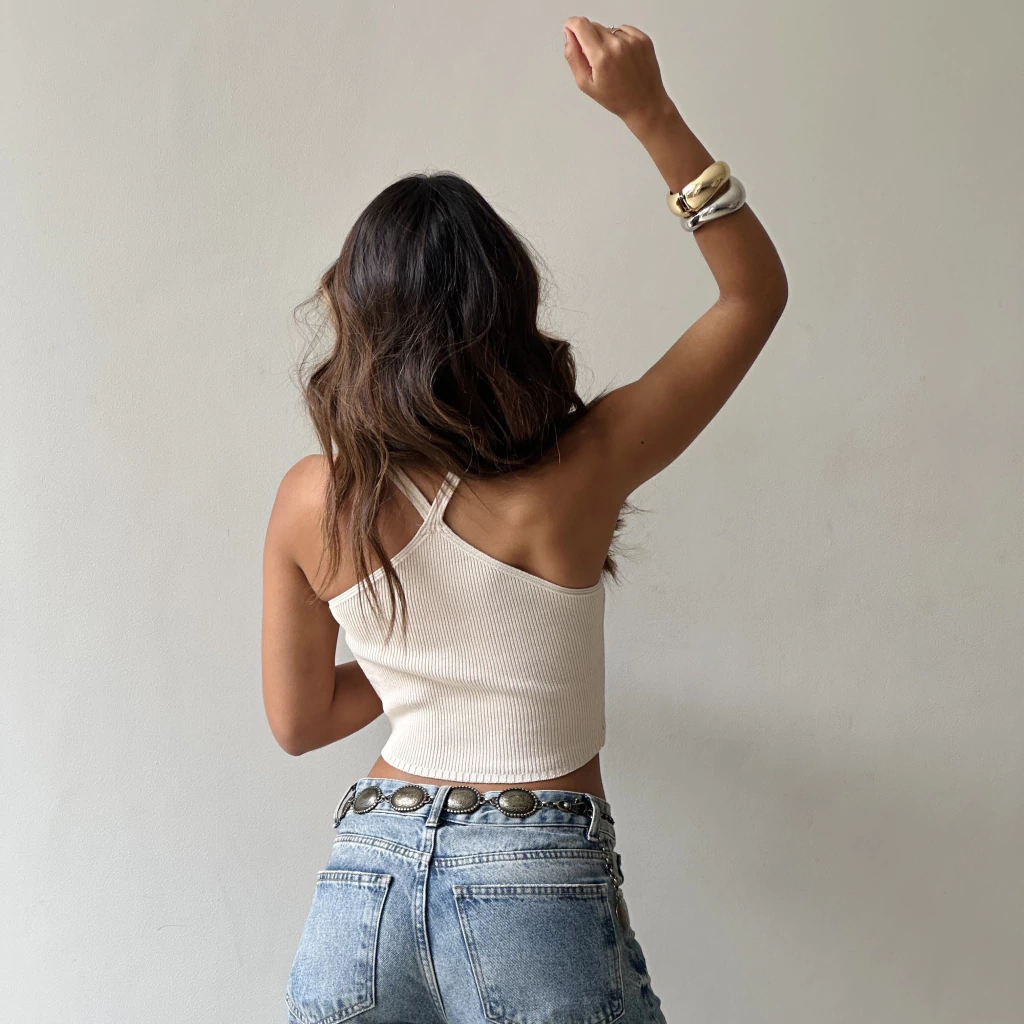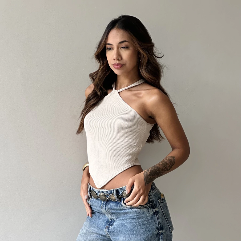 Blusa em tricô com modelagem assimétrica e alças que se cruzam no pescoço, criando um decote moderno e elegante. O caimento ajustado valoriza a silhueta, enquanto a barra em bico confere um toque diferenciado ao visual. Uma peça versátil e sofisticada, ideal para compor looks frescos com personalidade.