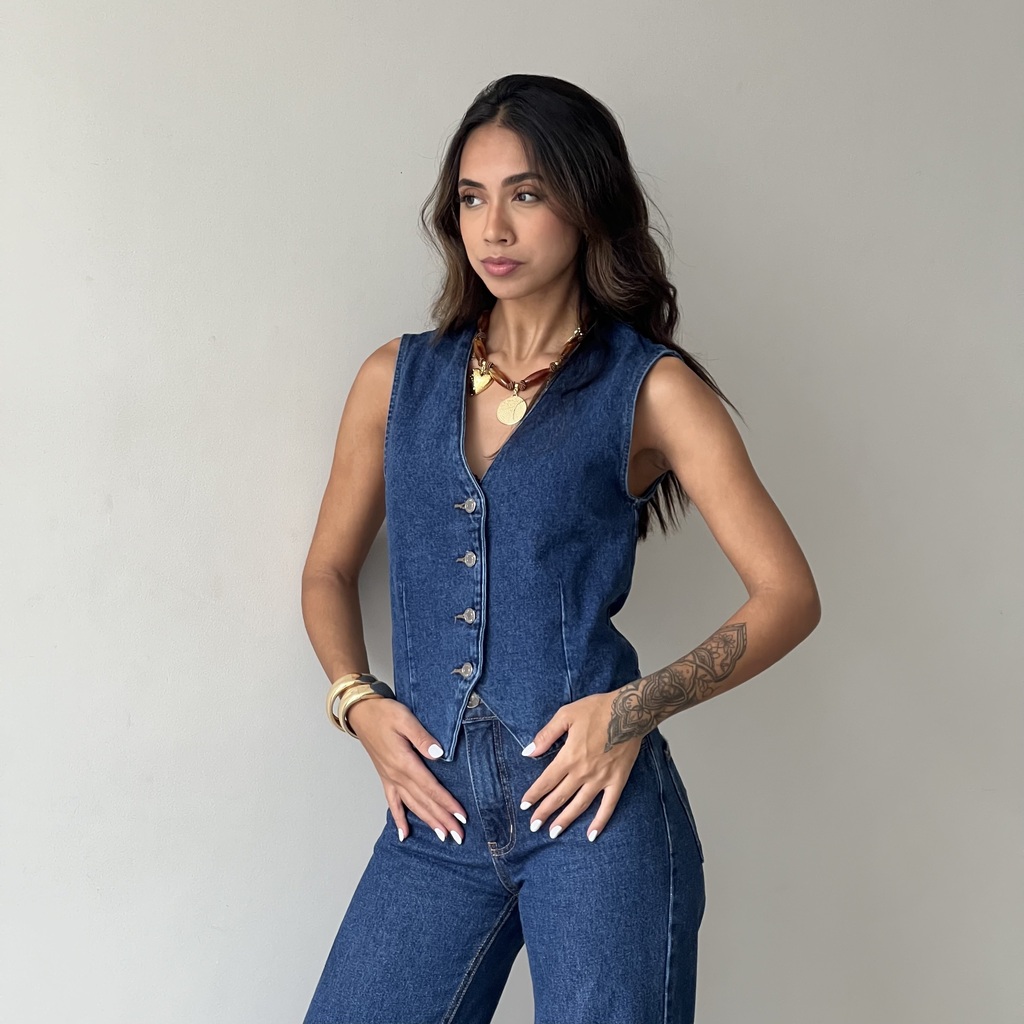 Colete em jeans de lavagem escura com modelagem reta e caimento estruturado. Possui decote em V profundo, gola levemente marcada e fechamento frontal por botões metálicos, que adicionam um toque utilitário ao visual. Versátil e atemporal, é a peça ideal para composições modernas — usado sozinho ou sobreposto, ele imprime personalidade sem perder a elegância.
