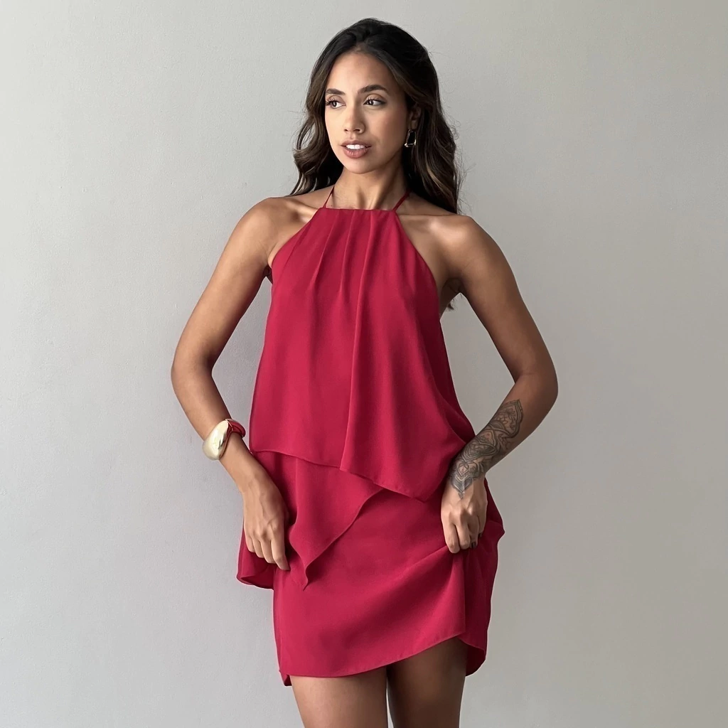 O Vestido Gaia traz charme e leveza ao seu guarda-roupa. Com comprimento curto, camadas de babado e frete única por amarração, ele valoriza a silhueta com delicadeza. Possui forro, garantindo conforto, e as costas levemente abertas adicionam um toque moderno. Ideal para quem busca um look feminino, fresco e cheio de personalidade para dias especiais.