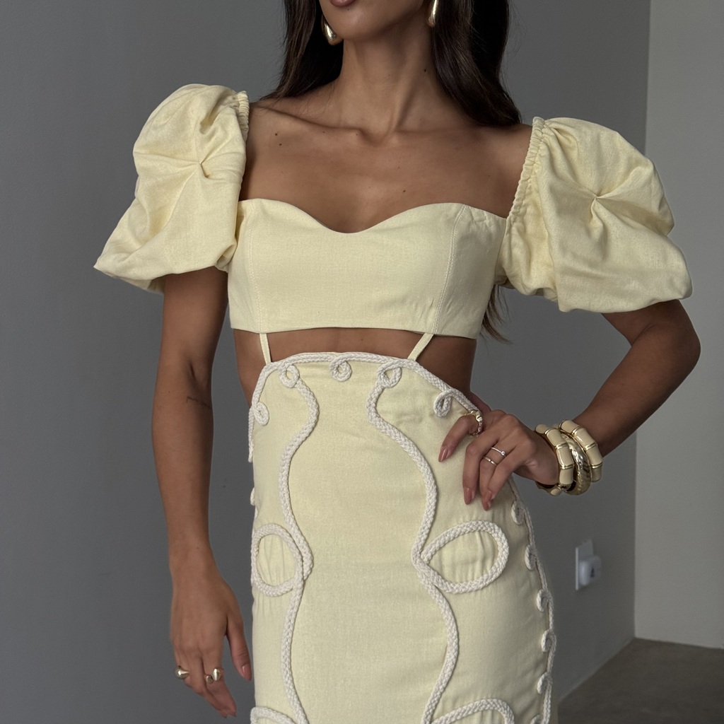 Este modelo possui comprimento midi, valorizando a silhueta com seu decote coração e as charmosas mangas bufantes. O recorte delicado na cintura realça a feminilidade, enquanto a saia com detalhes em bordado delicadeza à peça. Nas costas, o vestido conta com lastex e zíper, garantindo ajuste confortável e seguro ao corpo. Aposte em um visual sofisticado, leve e cheio de personalidade!